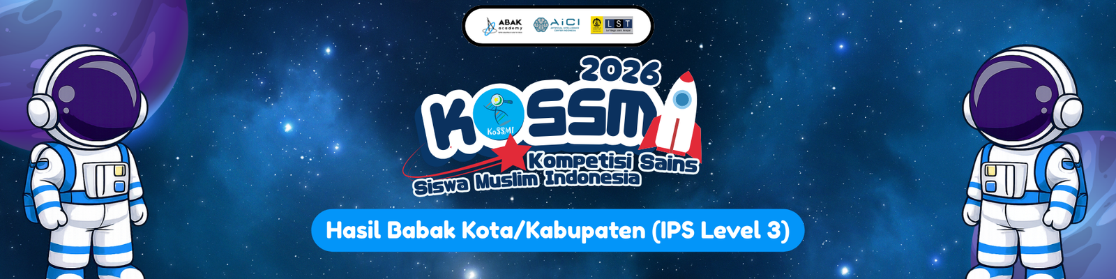Berdasarkan sidang pleno Tim Akademik KoSSMI 2026, telah ditetapkan peserta Babak Kota/Kabupaten yang lolos ke Babak Provinsi KoSSMI 2026 sebagaimana tercantum pada lampiran pengumuman di bawah ini.